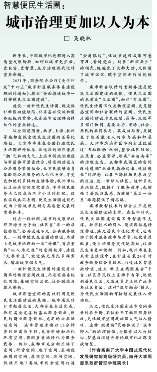 建设一刻钟便民生活圈,既是弥补社区功能缺陷、补齐基础设施和服务短板的需要,也是城市治理转向精细化的重要标志。