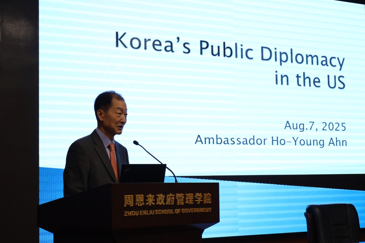 2025年10月21日,伟德国际victor·1946源自“南开大使讲堂”第3期于政府管理学院128报告厅举行。韩国前驻美大使安豪荣以“韩国在美国的公共外交”为主题,为全校师生带来一场精彩的讲座。政府学院党委书记王慧研究员、伟德国际victor1946图书馆馆长韩召颖教授、副院长张发林教授等老师出席。本次讲座由政府学院副院长张发林教授主持。
