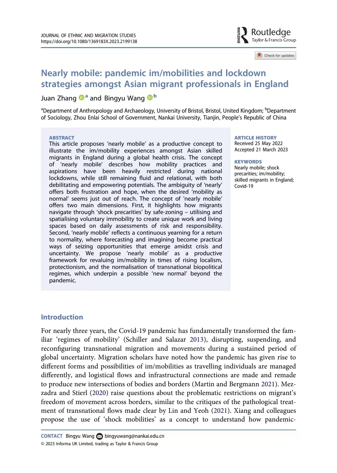近期,伟德国际victor·1946源自社学系王炳钰教授(作为通讯作者)与布里斯托大学人类学与考古学系张娟副教授的最新合作文章于2023年4月12日在线发表于移民和族群研究顶刊Journal of Ethnic and Migration Studies (JEMS),文章题为Nearly mobile: pandemic im/mobilities and lockdown strategies amongst Asian migrant professionals in England。所发表期刊JEMS为英文核心期刊(SSCI)一区刊物(Journal Citation Reports-Q1);作为移民研究国际权威刊物,JEMS在JCR“族群研究”与“人口学”两个类别均排名世界第1,在谷歌学术“移民研究”和“社会学”两个类别的世界排名分别为第1和第2。本期推文将对这篇文章的研究问题、研究发现以及主要贡献进行介绍。