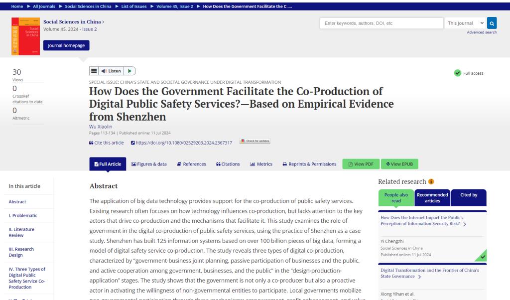 6月11日,学院吴晓林教授撰写的论文How Does the Government Facilitate the Co-Production of Digital Public Safety Services?—Based on Empirical Evidence from Shenzhen发表在《中国社会科学(英文版)》(Social Sciences in China)上。