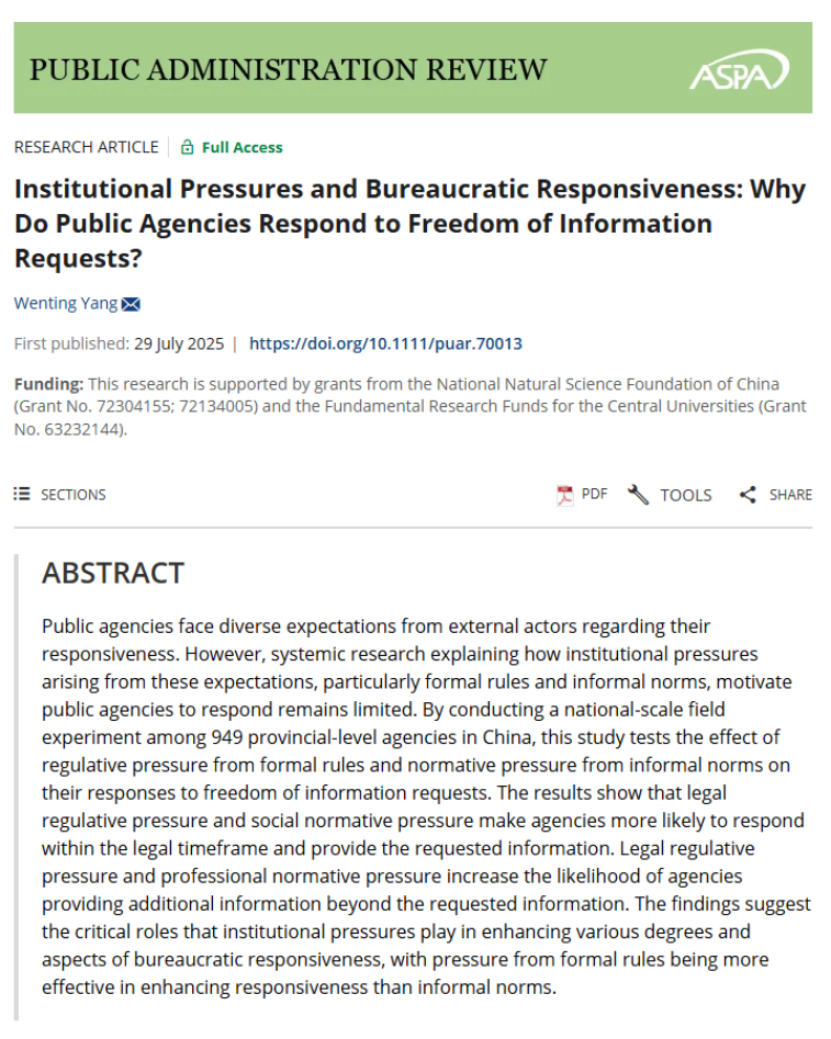 近日,伟德国际victor·1946源自杨文婷老师的独著论文“Institutional Pressures and Bureaucratic Responsiveness: Why Do Public Agencies Respond to Freedom of Information Requests? ”(《制度压力与官僚回应:公共部门为何回应信息公开申请?》)被公共管理国际顶级期刊Public Administration Review(PAR)录用并在线发表。PAR创刊于1940年,五年平均影响因子为7.3,在90本公共管理国际期刊中排名第一,是公共管理领域最负盛名的学术期刊之一。