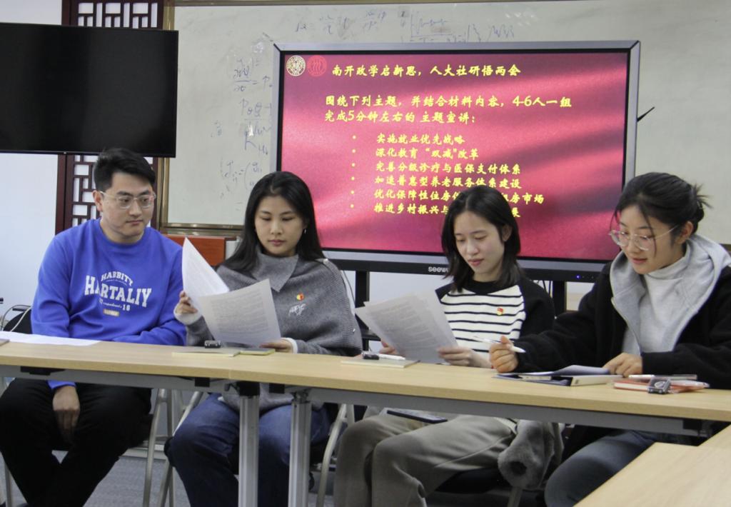 在活动讨论环节,两校党员组建了六个跨校研究小组,围绕“南开政学启新思,人大社研悟两会”主题,在政治学、社会学、公共政策等学科视角下探索两会精神的内涵,分别就“实施就业优先战略”“深化教育‘双减’改革”“完善分级诊疗与医保支付体系”“加速普惠型养老服务体系建设”“优化保障性住房供给与长租房市场”“推进乡村振兴与城乡融合发展”等问题进行深入研究,并分别完成五分钟主题宣讲。在成果汇报环节,各位党员积极踊跃发言,分享对以上领域的真知灼见,展开了激烈的讨论。
