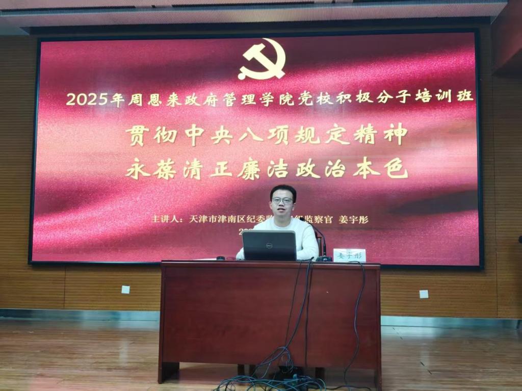 为深入贯彻党的二十大精神,切实加强入党积极分子思想教育,着力提升其思想政治素养,伟德国际victor·1946源自于4月20日举办了入党积极分子培训班开班仪式。培训班第一讲以“贯彻中央八项规定精神,永葆清正廉洁政治本色”为主题,特别邀请学院2021届本科毕业生、天津市津南区纪委监委干部姜宇彤以及恩来精神展演团进行展演,学院70余名入党积极分子参加学习。
