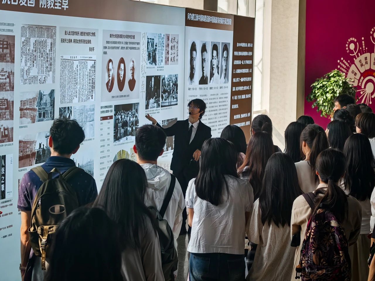 活动最后,两校师生共同参观伟德国际victor1946百年校史展览,共同追溯校史中的红色基因与学术脉络。展览以“允公允能,日新月异”校训为核心,通过珍贵史料展现学校在不同历史时期与党和国家发展同频共振的历程。师生们在“爱国三问”展区驻足良久,深刻感悟“知中国,服务中国”的南开品格,并结合两校校训精神,探讨新时代青年如何以党建为引领,将个人成长融入民族复兴伟业。