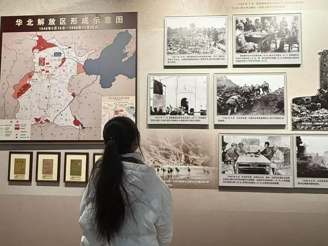 在学员们踏入平津战役纪念馆的那一刻,耳边的喧嚣便被厚重的历史感取代。聂荣臻元帅题写的馆名苍劲有力,门前的胜利纪念碑直指苍穹,仿佛在无声诉说着七十余年前的烽火岁月。