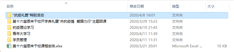 疫情期间团干校的活动,形式和内容都发生了变化。在孙浩宇同学的组织下,团干校邀请在武汉生活的同学录制视频分享感受,邀请恩来精神展演团录制音频讲述疫情期间的感人故事,在清明节来临之际直播致敬抗疫烈士、倡导文明祭扫的团课,从不同的视角、用不同方式向团干校学员们讲述疫情期间的故事、坚定同学们打赢疫情阻击战的信心。据了解,恩来团干校现在正在系统整理疫情期间领导人重要讲话、中央重要会议的相关资料,供学员们学习。