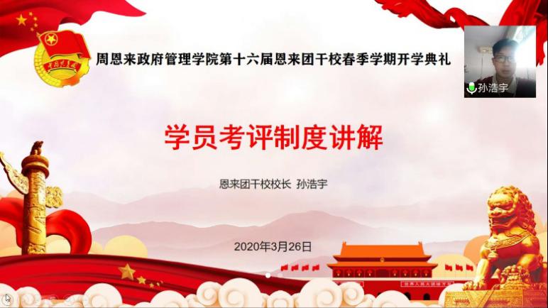 2020年3月26日下午,当第十六届恩来团干校春季学期开学典礼结束之后,坐在电脑前的恩来团干校校长孙浩宇终于松了一口气:“这次线上活动总算顺利完成!”可是没过多久,他又投入了工作,他还需要整理团课资料、检查学员考勤结果、审核新闻稿……
