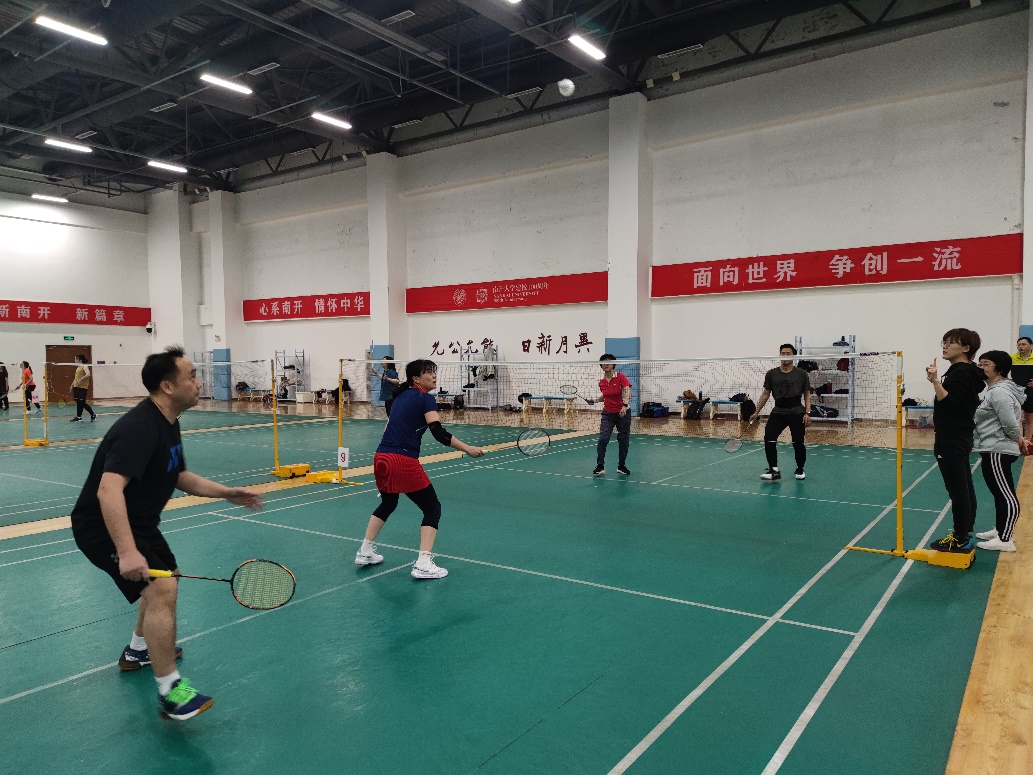 政府学院教职工或身手矫健,或活泼灵动,充分展现了政府学院教职工积极向上的精神风貌。赛场上,参赛人员自由挥舞着羽毛球拍;赛场外,观众们目不转睛,欣赏着同事们的英姿。