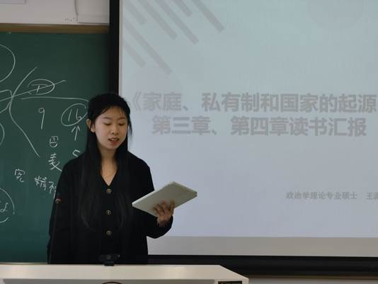 《家庭、私有制和国家的起源》(下文简称《起源》)是恩格斯阐述历史唯物主义基本理论的重要著作。中心学子围绕《起源》一书,依次对原著各章节进行内容解读与延伸讨论。唐康通过对比第一版序言和第四版序言,对相关重点语句进行解读。沈杨帆分享了本书第一章的内容,该部分通过系统阐述原始社会史,丰富与发展了唯物史观。李幸美对《起源》第二章进行解读,强调家庭的产生、存在和发展过程,必然要受到特定社会经济关系的制约。王潇对第三、四章内容,即易洛魁人与希腊人氏族组织的基本特征进行了阐述,并着重说明了阶级和国家是从父系氏族中产生的。李柯蔓与邵竟轩、李沐熹分别对本书第五章、第六至八章内容进行了研读,分享了雅典国家、罗马国家与德意志国家不同类型国家的产生过程。张龙辉与张瀚予介绍了第九章的内容,该部分对家庭、私有制与国家之间的互动关系展开了论述,并做出了私有制与国家终会消亡的判断。在交流互动环节,与会学生就社会公平、社会结构等议题展开了进一步探讨,交流讨论气氛热烈。