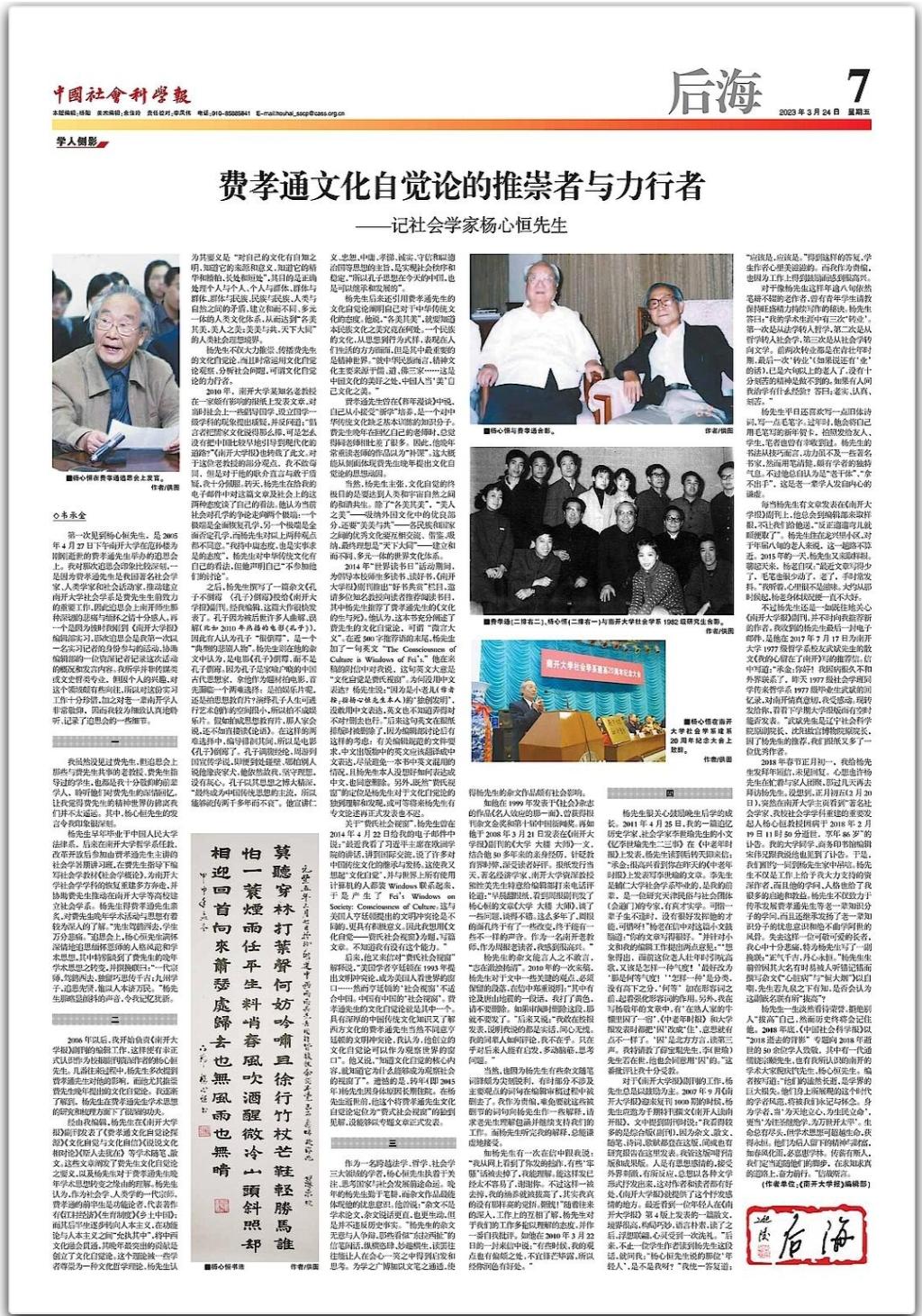 杨先生不仅大力推崇、传播费先生的文化自觉论,而且时常运用文化自觉论观察、分析社会问题,可谓文化自觉论的力行者。